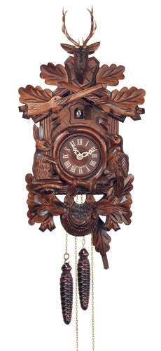 All mechanical cuckoo clocks with moving figurines, music or 8-days-movement have wooden hands, a wooden cuckoo and night switch-off.