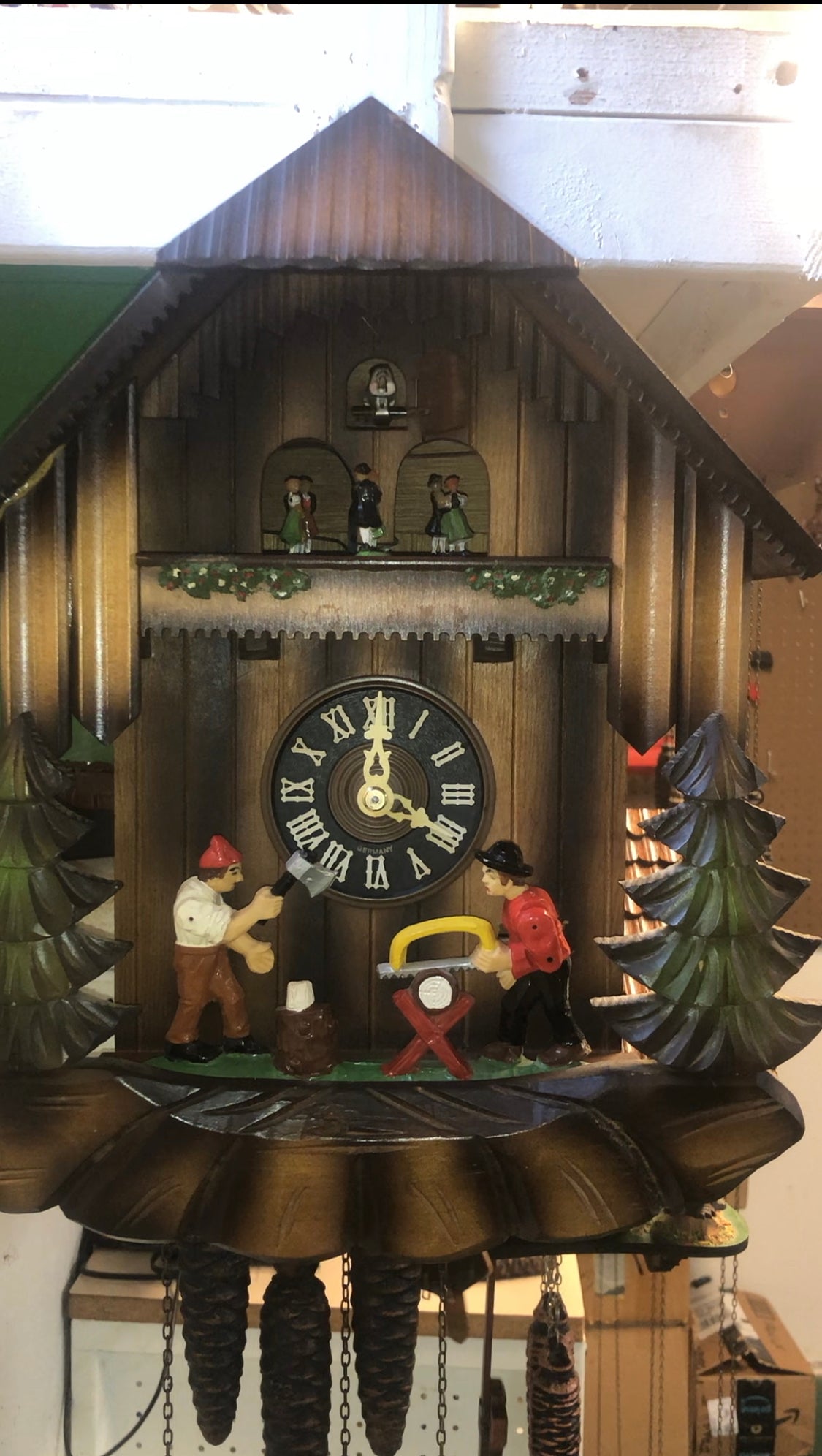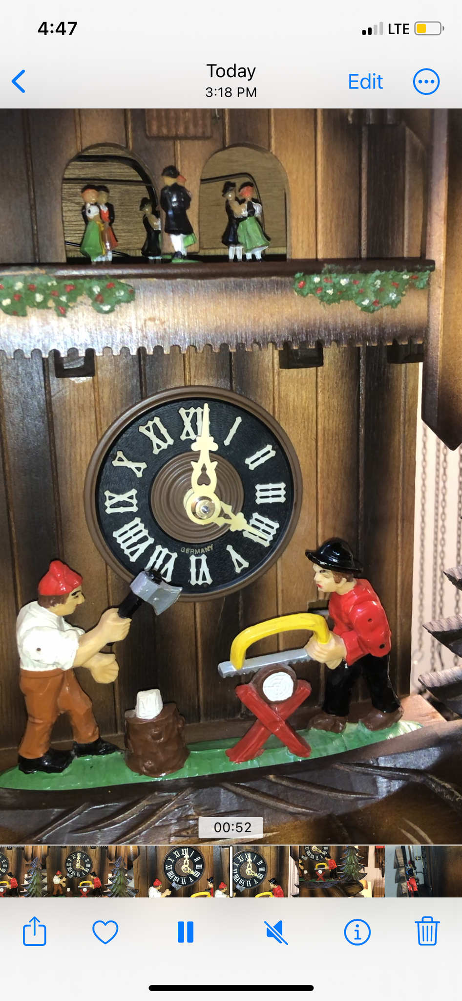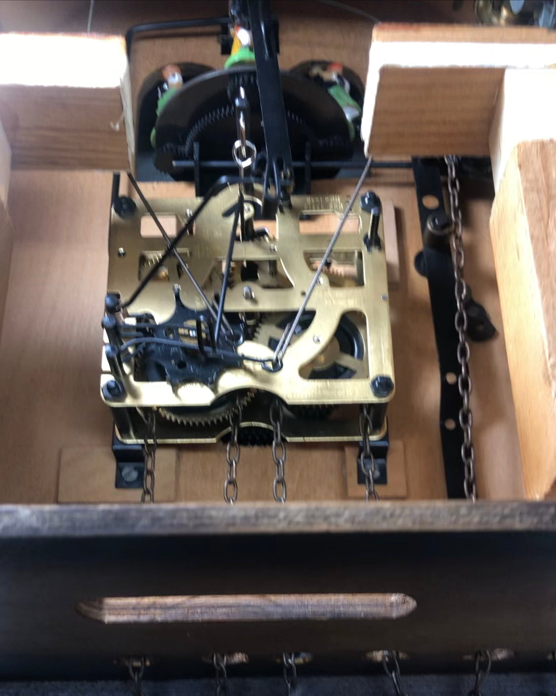 as discussed when the clock was dropped off. The music dance platform, music box chainwheel, crown gears, and cam gear are plastic with no real direct replacement. care should be taken when winding the music box chain. Nice steady wind (no constant starting and stopping) try to avoid pulling I to the bottom of the case and release thw weight gently. 1 year warranty on Regula 25 movement and governor.
