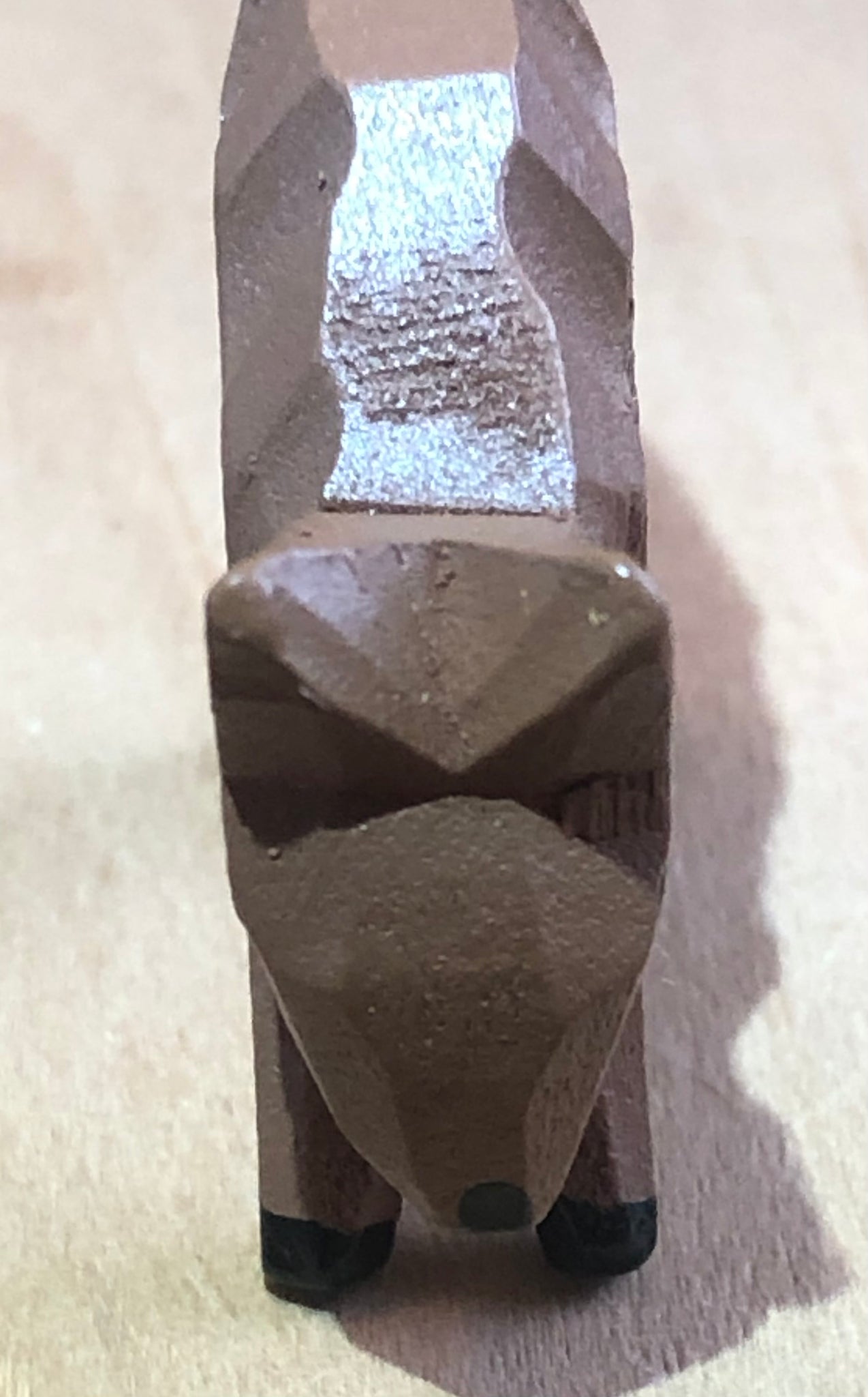 These wooden deer, standing with their heads down, are new and hand painted. They measure 3.2 cm in length, 0.8 cm in width, 3 cm in height.
