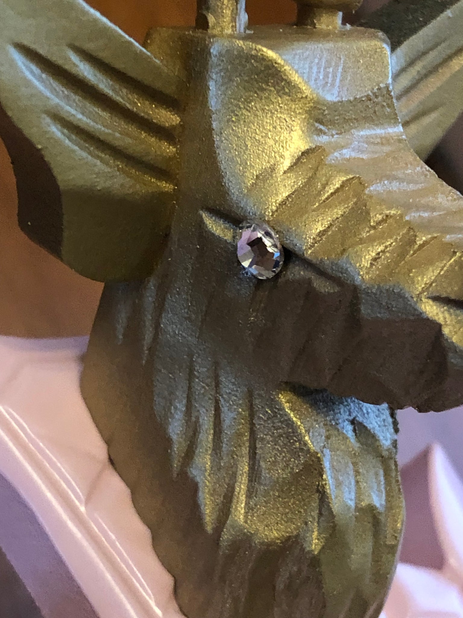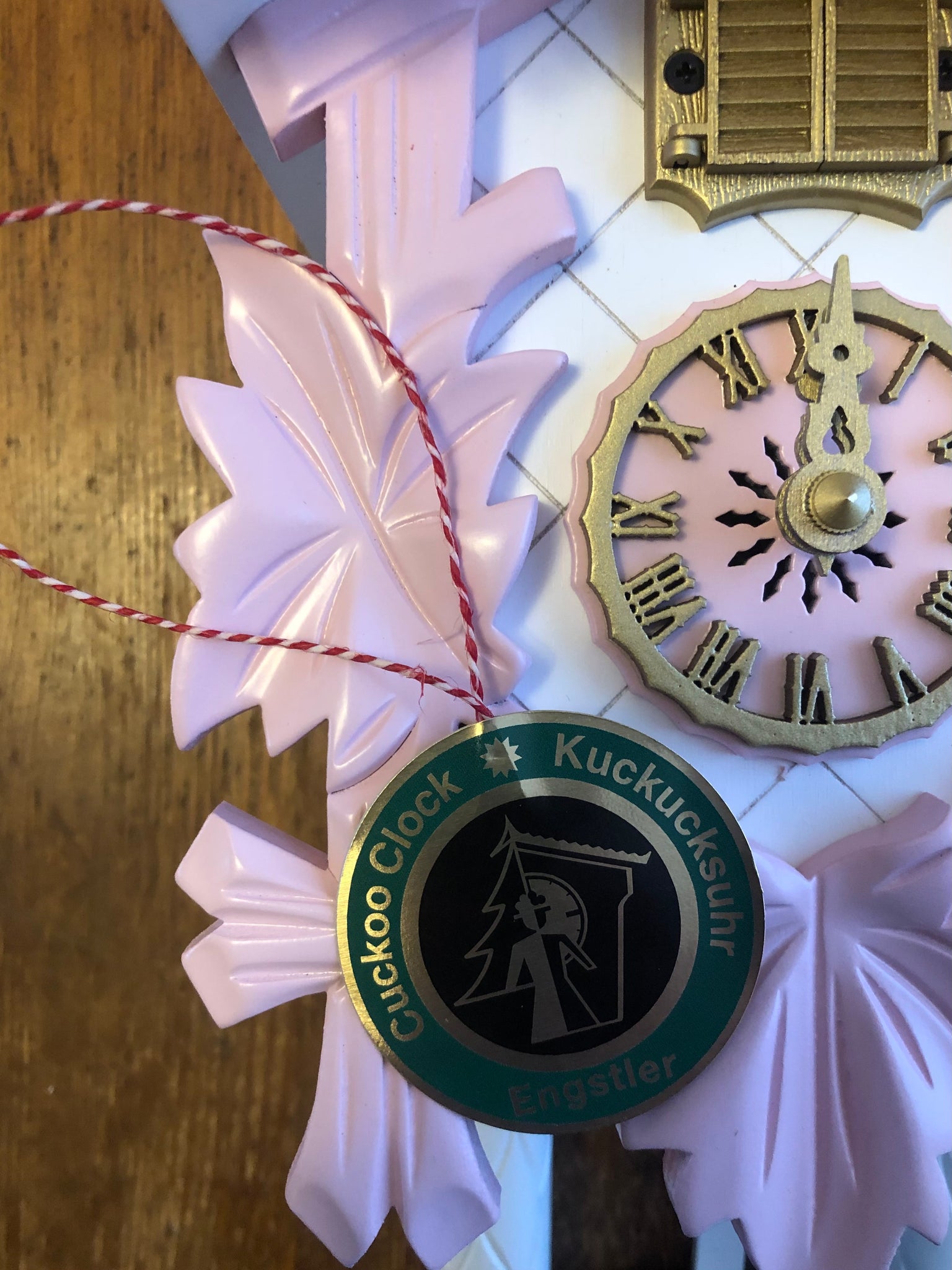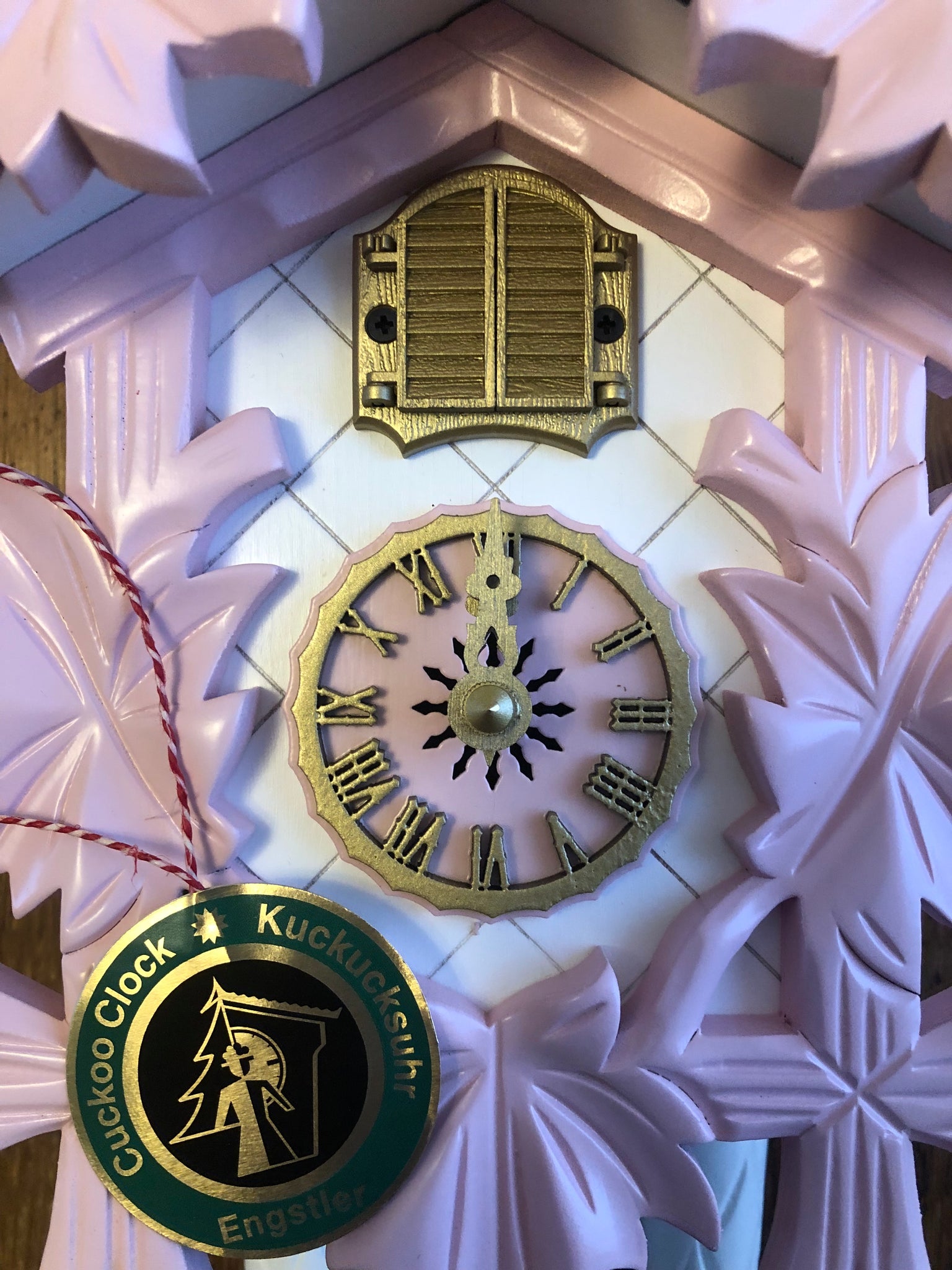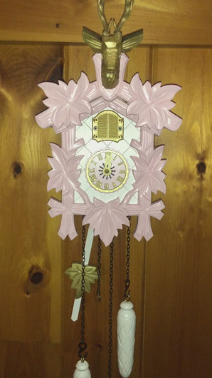 It is a one day cuckoo, in a traditional style, with a stag head, but has updated colors of light pink with gold accents. The stag has eyes of Swavorski crystal. (Note : Care should be taken when placing the antlers in place).