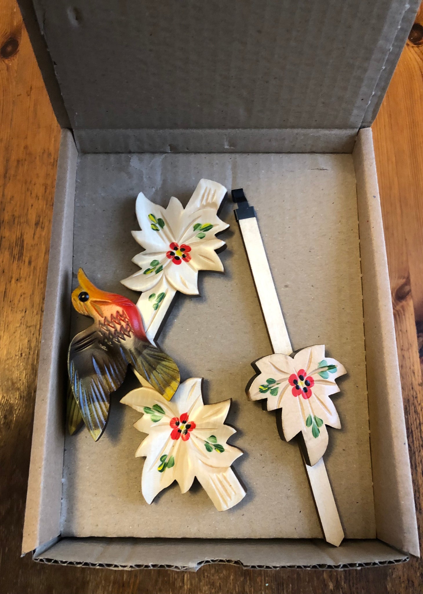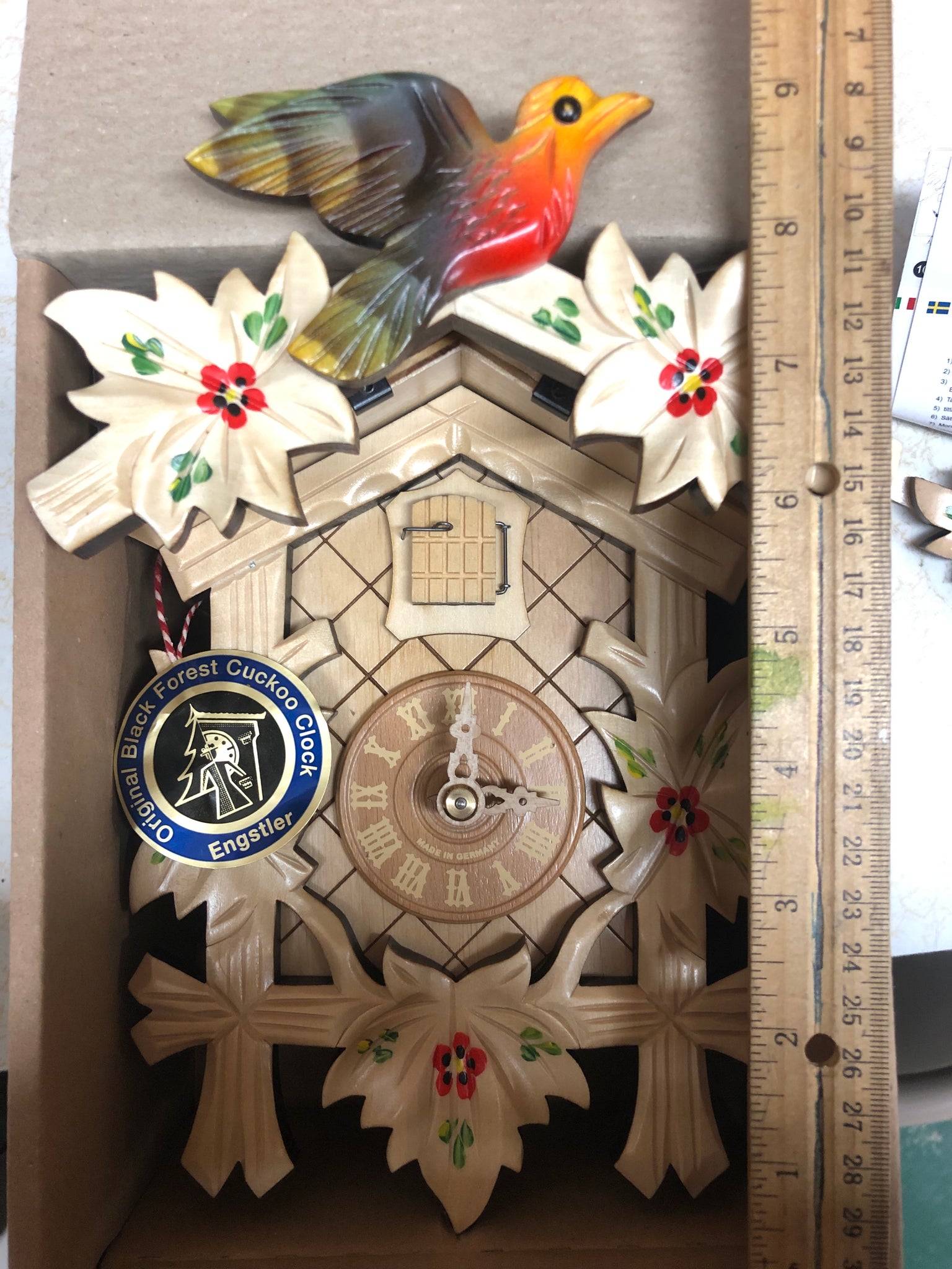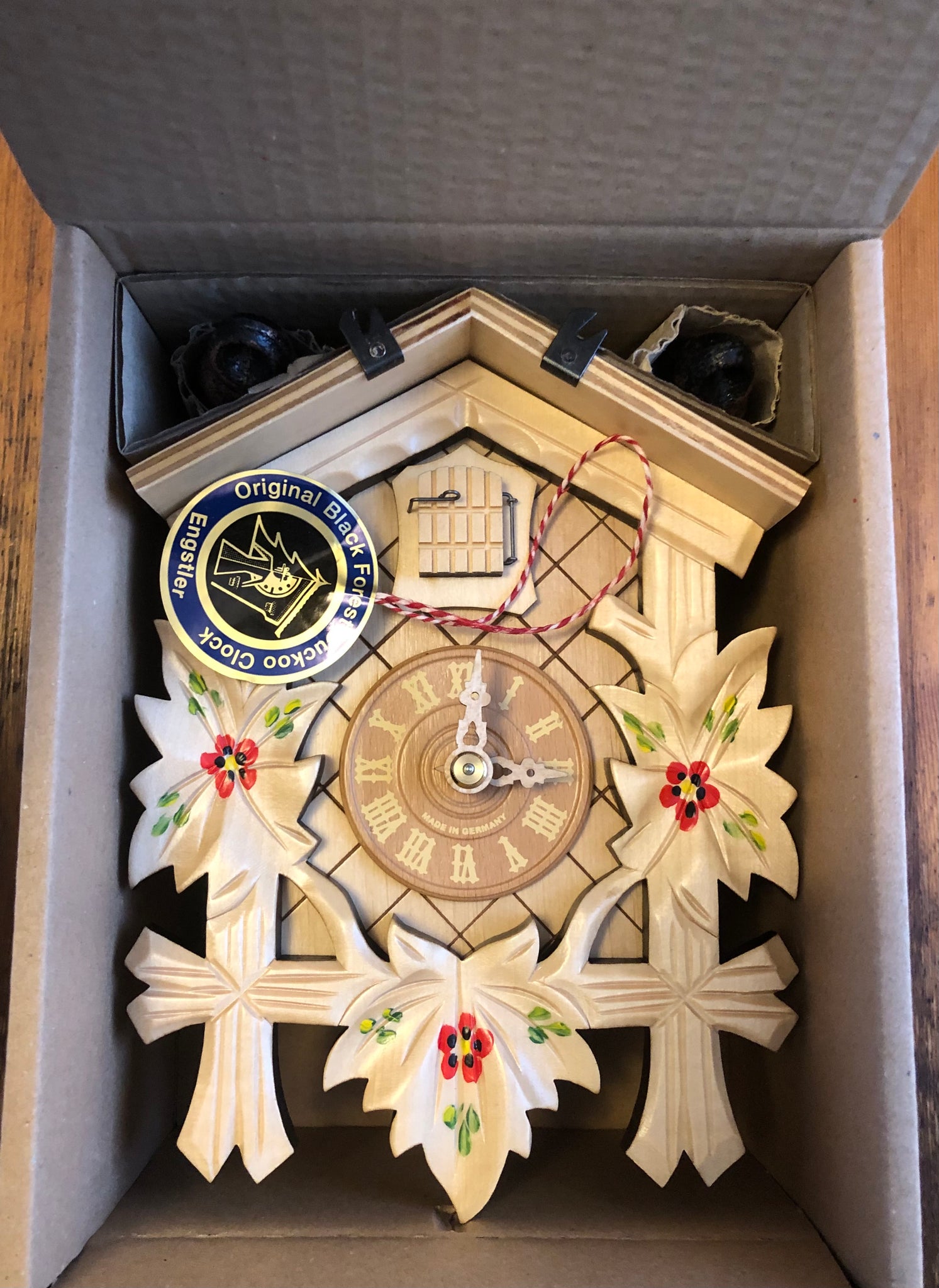It is a “new in box” and was only removed to allow for pictures. This one day mechanical cuckoo clock is in the traditional bird and leaf style. This has a natural finish, then additionally hand painted with a flower motif. All clocks are hand carved and will vary slightly from photo.