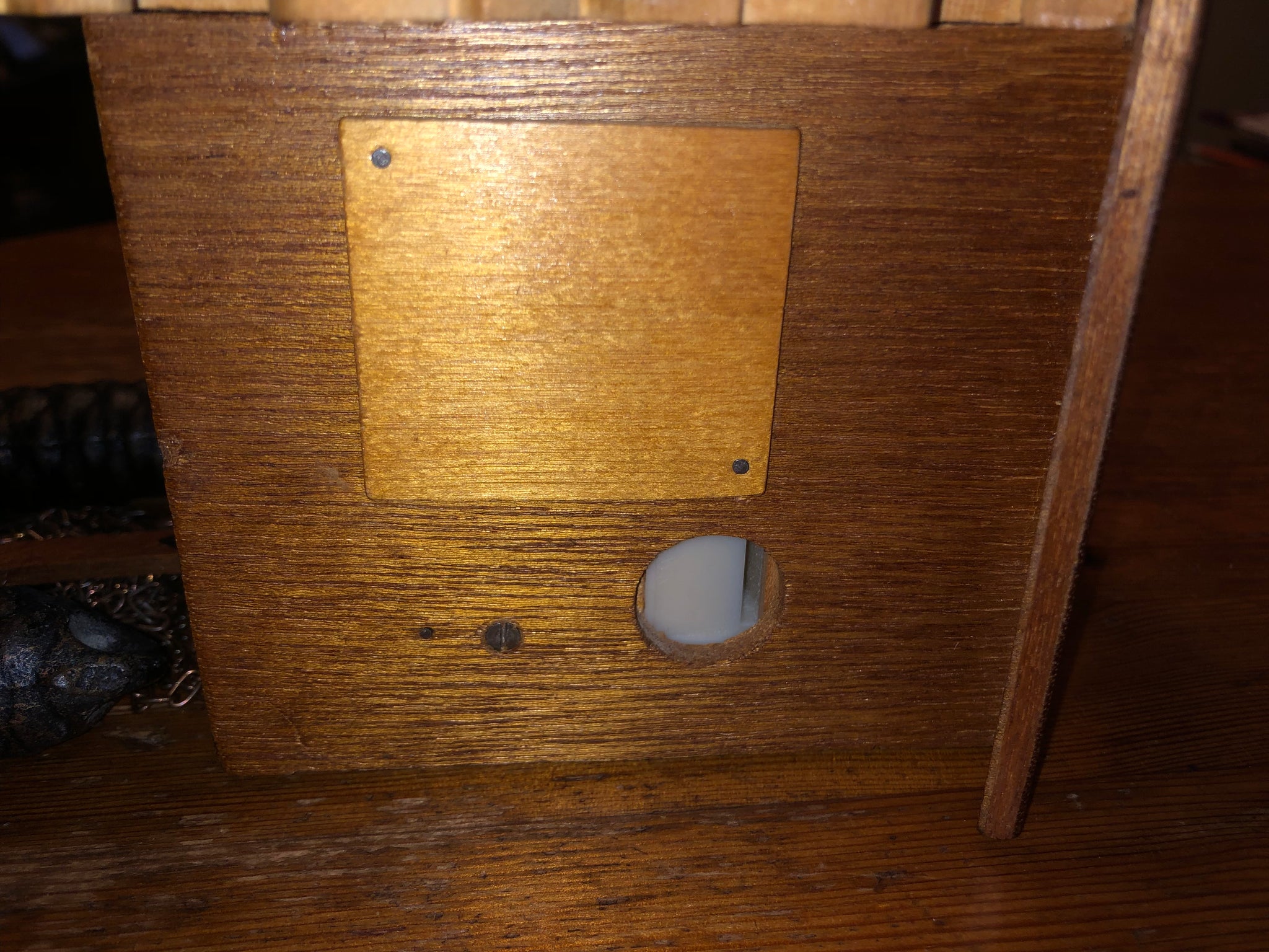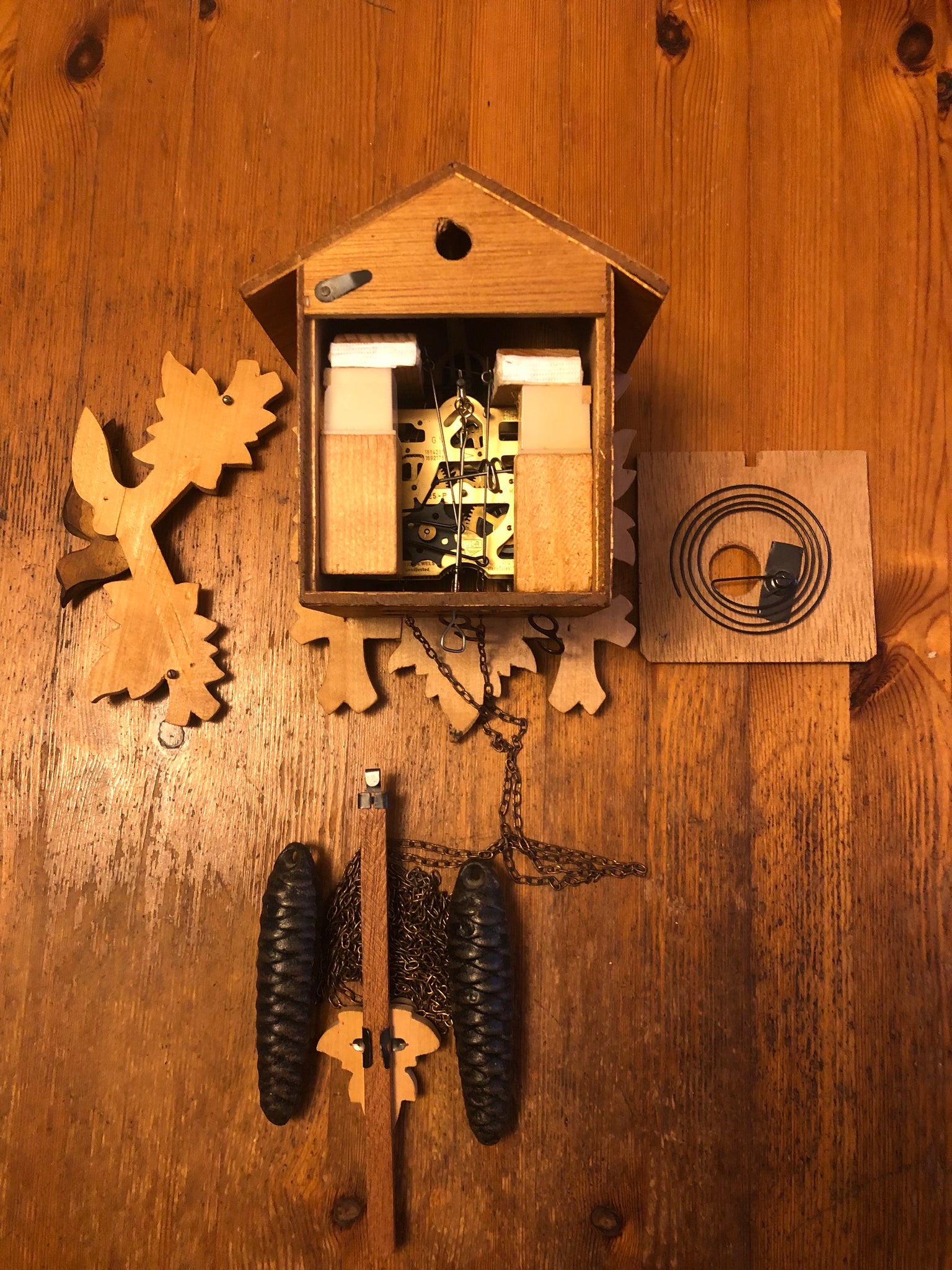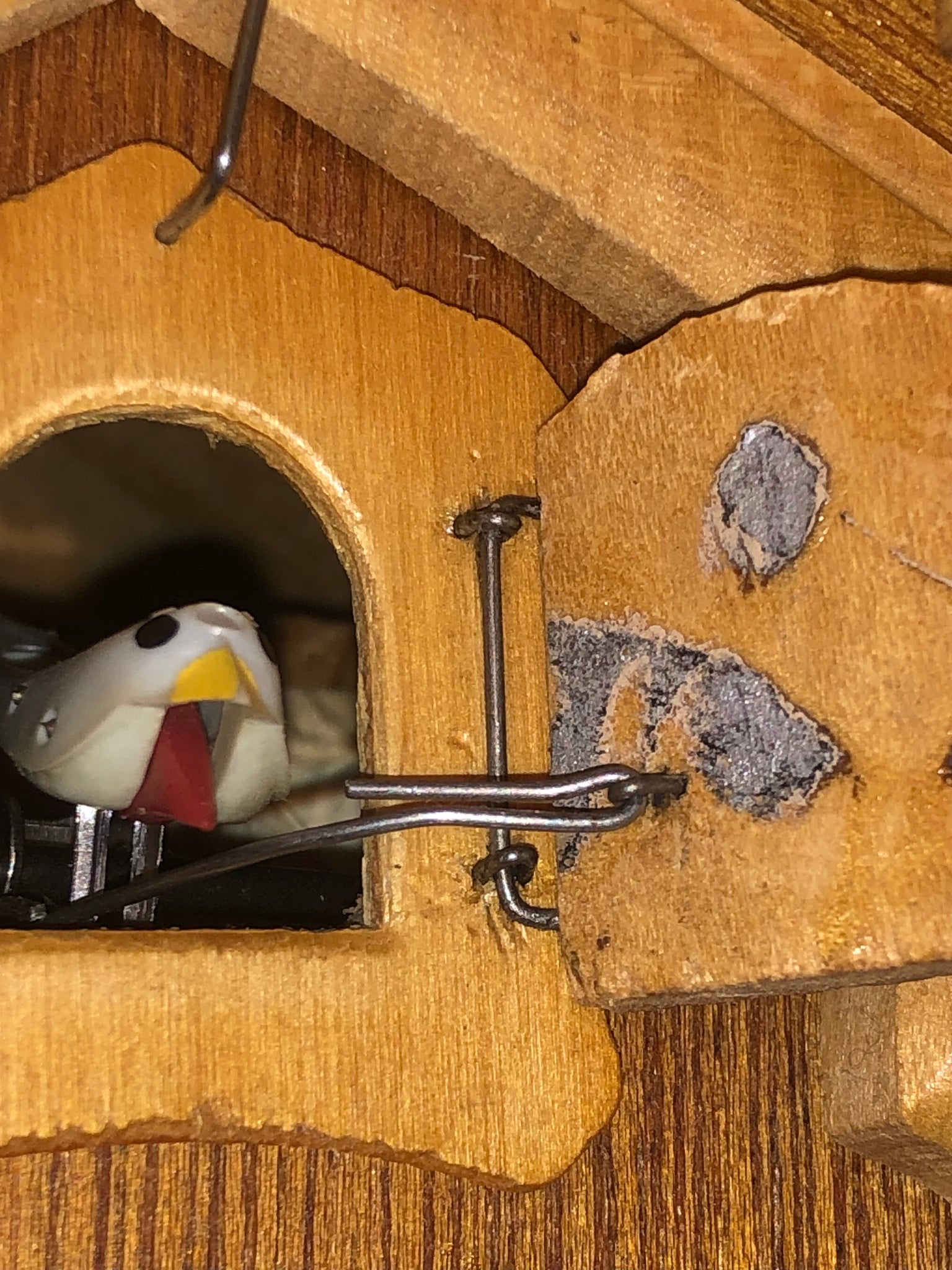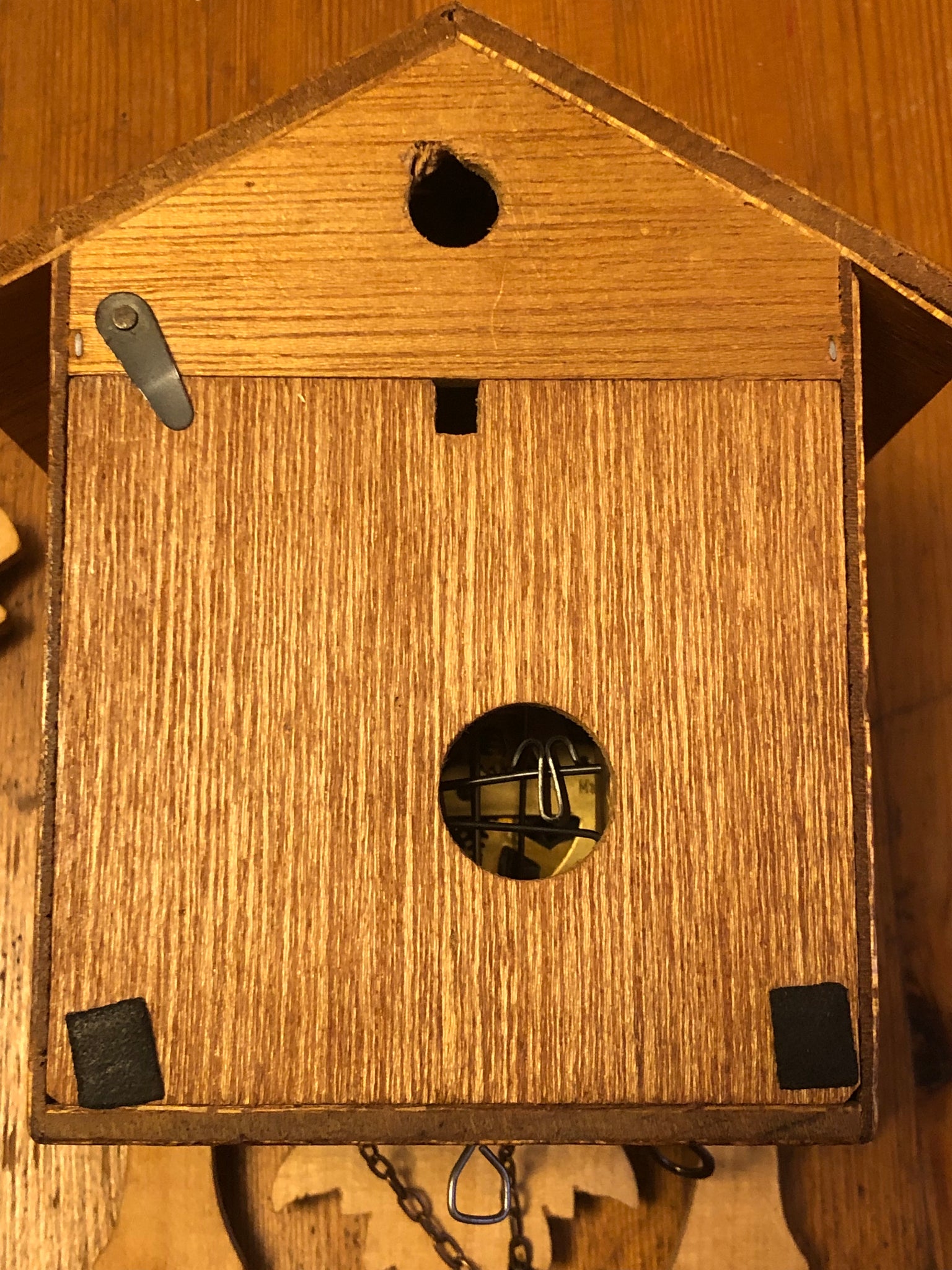The cuckoo can be sped up or slowed down by a bob on the pendulum, that slides up and down.