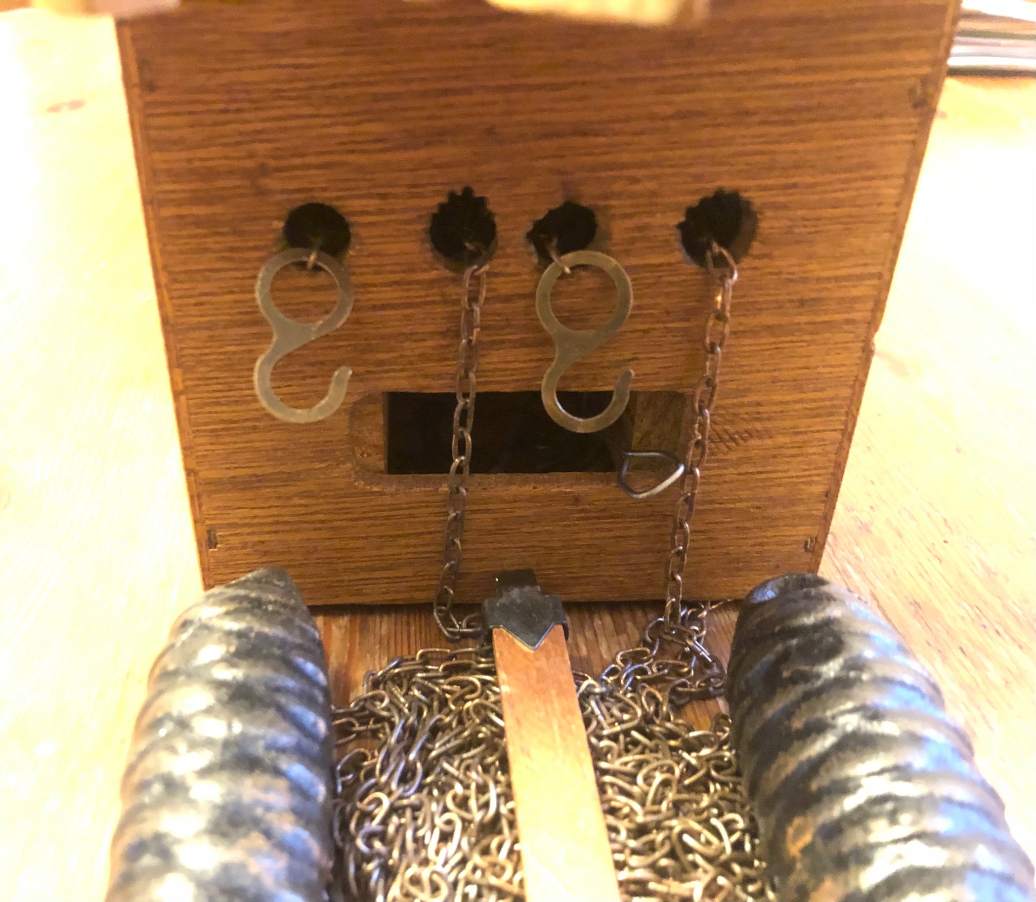 5.Hang the pendulum on the clock, attach the cone weights, then wind the clock by pulling each cone weight up to the base of the clock. (Don’t lull the weights, pull the side of the chain with the round ring)