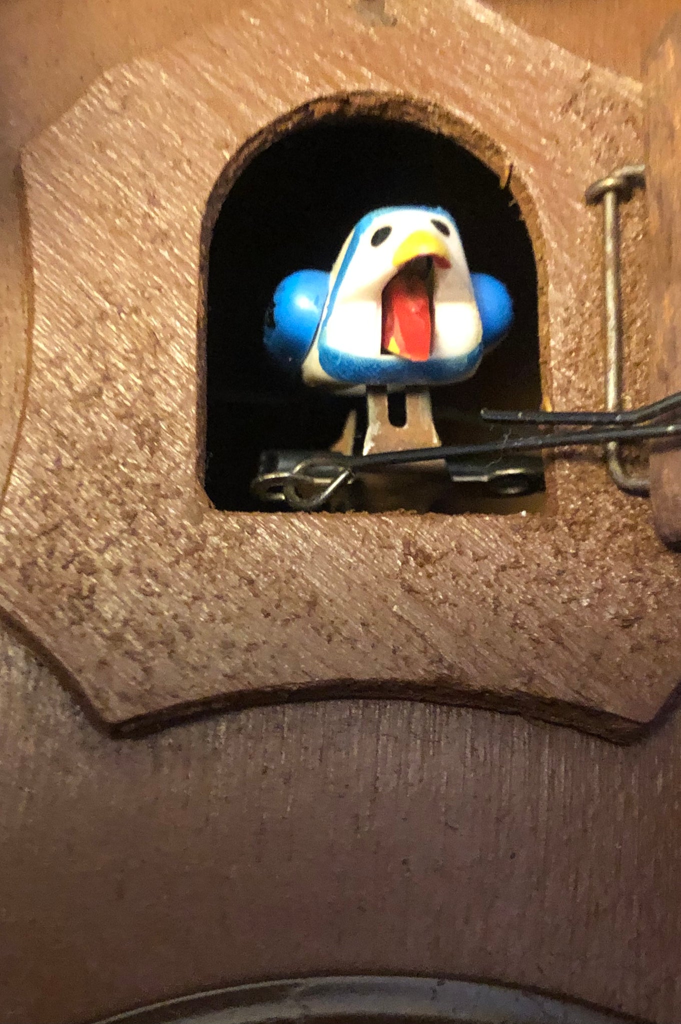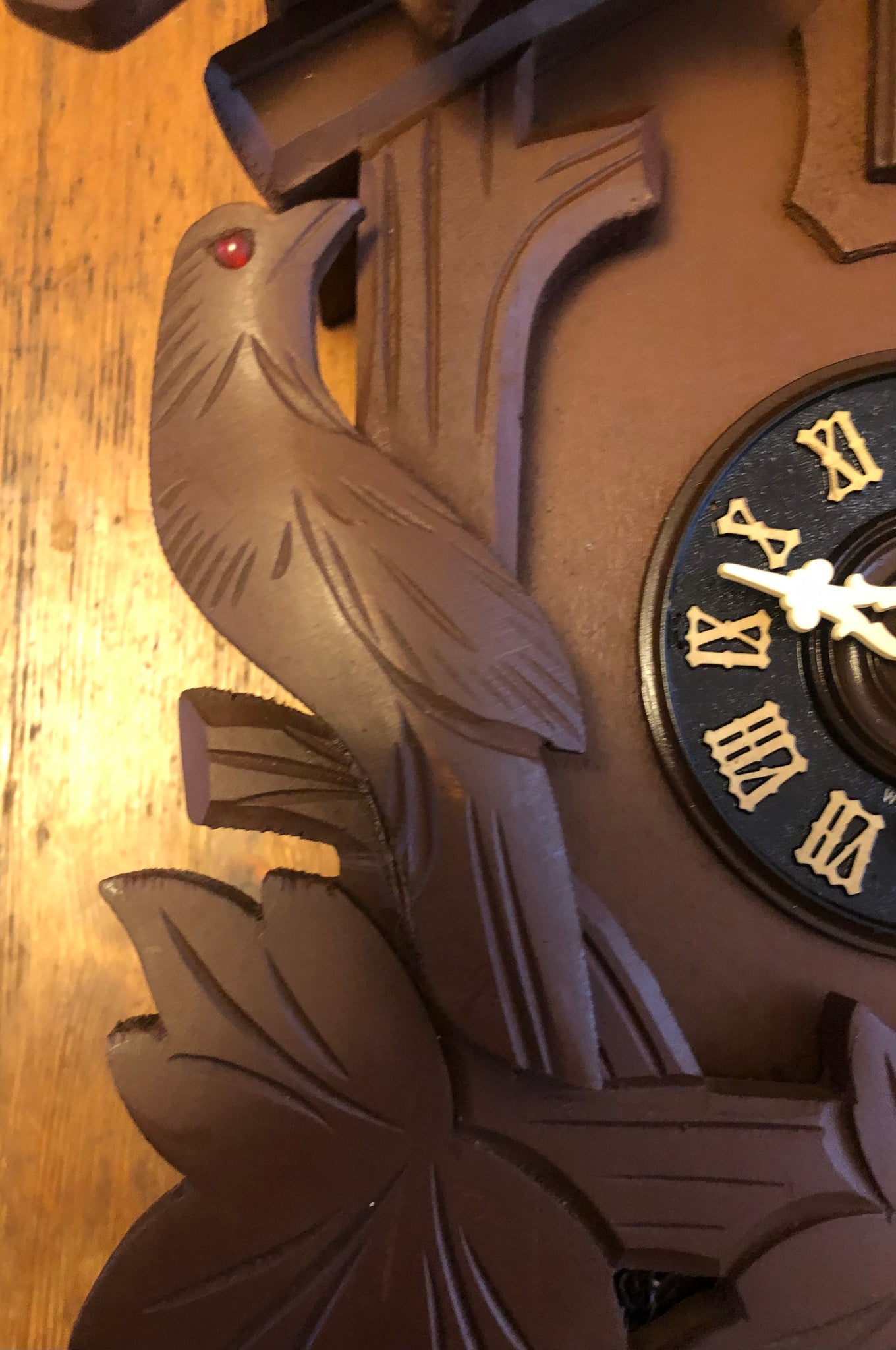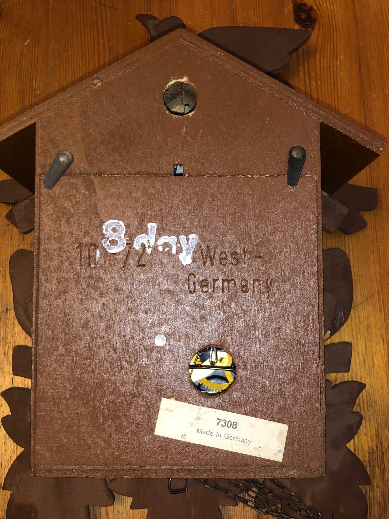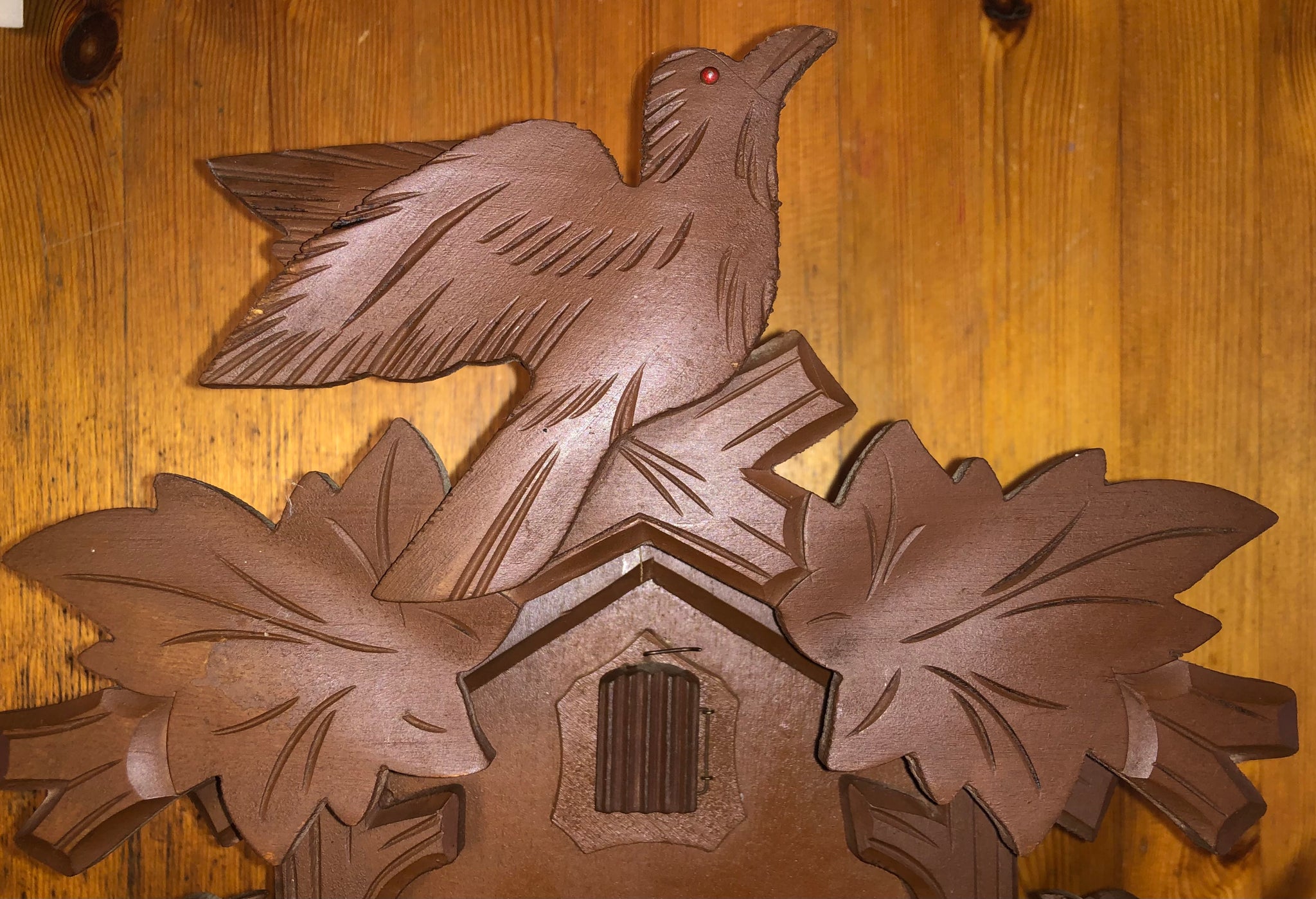 This is a well built and solid cuckoo clock, with an eight day movement that only need winding once weekly.